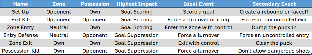 Above are the six states of hockey based on who has possession in which zone. I made sure to omit the words offense and defense. In a sport like football or basketball, the team with possession is making plays that are impacting their chances of scoring more than their suppression of the opponent’s scoring. Because of the blue lines and center ice line, there are two states in hockey in which you are playing offense (affecting goal scoring) or defense (preventing goals against) with the opposite possession.